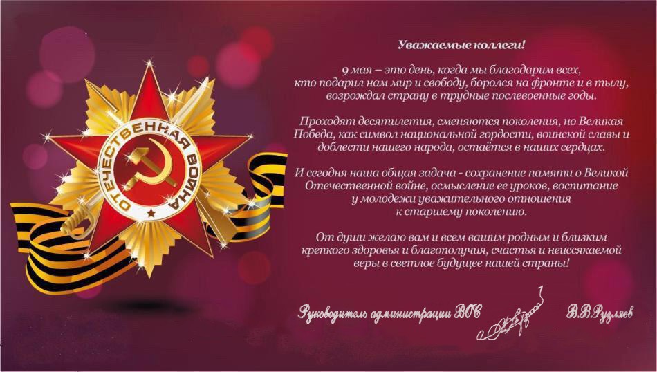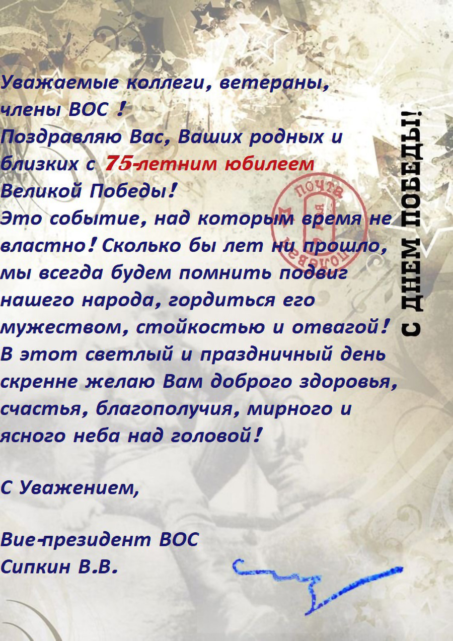 Поздравление членов ВОС с праздником Великой Победы от вице-президента ВОС В. В. Сипкина