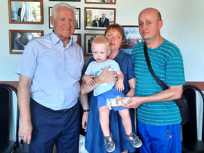 Председатель Краснодарской региональной организации ВОС Ю. С. Третьяк вручил семье беженцев из Харькова благотворительную помощь